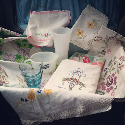 My haul included: lots of vintage linens & embroidery, a vintage suitcase, a milk glass vase, a vintage pyrex gravy boat, & two small blue vintage glasses that match a set of large blue glasses I inherited from my Granny. I was very excited to find those since I've never seen those anywhere else before!